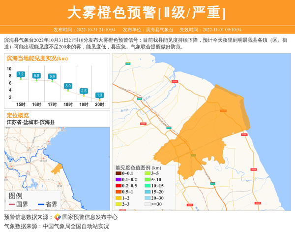 滨海县气象台2022年10月31日21时10分发布大雾橙色预警信号:目前我县能见度持续下降,预计今天夜里到明晨我县各镇(区、街道)可能出现能见度不足200米的雾,能见度低,县应急、气象联合提醒做好防范。 信息来源:国家预警信息发布中心; 发布单位:滨海县气象台。