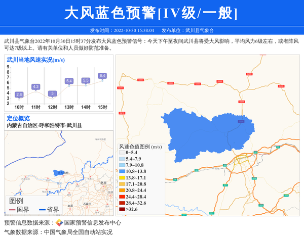 武川县气象台2022年10月30日15时37分发布大风蓝色预警信号:今天下午至夜间武川县将受大风影响,平均风力6级左右,或者阵风可达7级以上。请有关单位和人员做好防范准备。 信息来源:国家预警信息发布中心; 发布单位:武川县气象台。
