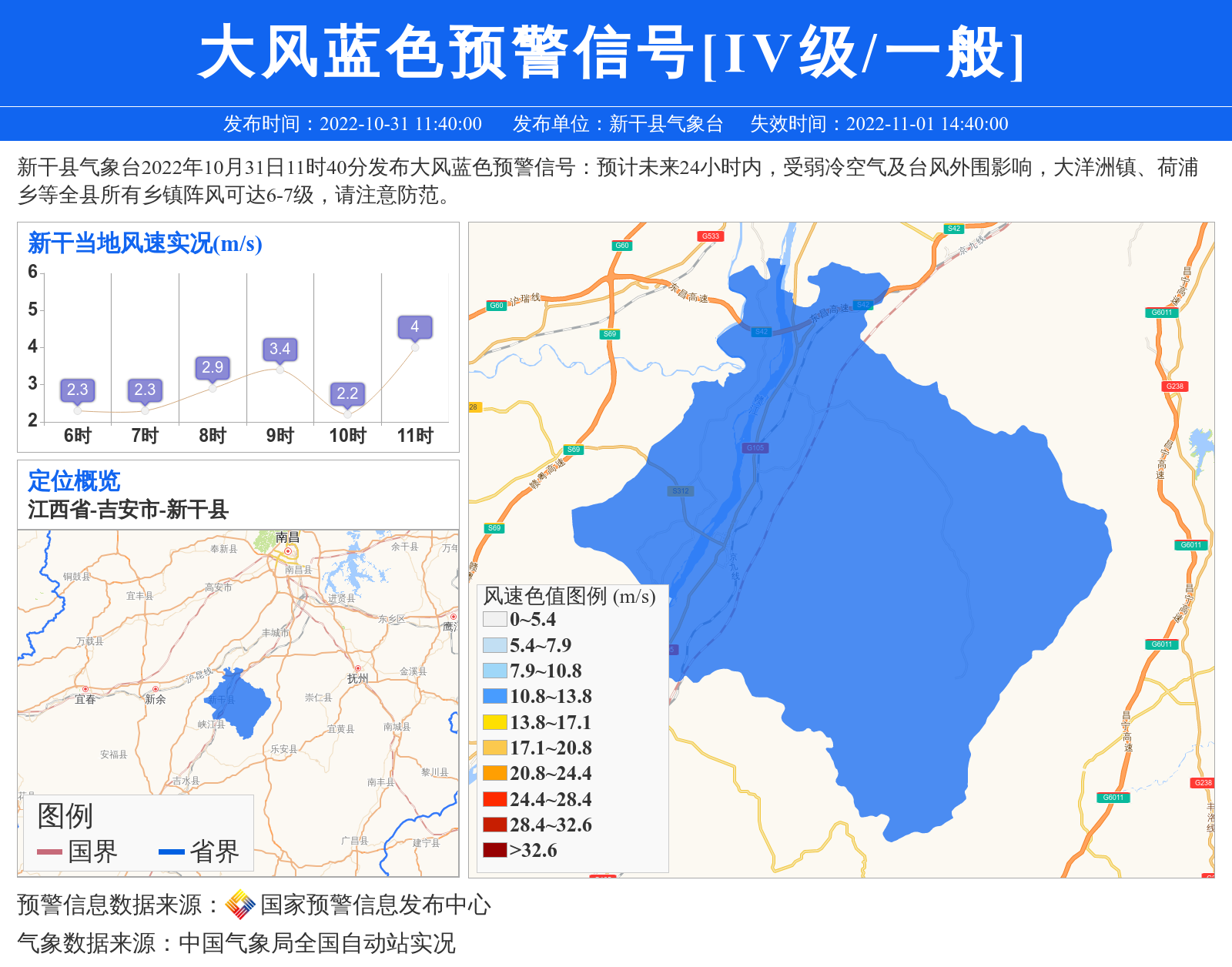 新干县气象台2022年10月31日11时40分发布大风蓝色预警信号:预计未来24小时内,受弱冷空气及台风外围影响,大洋洲镇、荷浦乡等全县所有乡镇阵风可达6-7级,请注意防范。 信息来源:国家预警信息发布中心; 发布单位:新干县气象台。