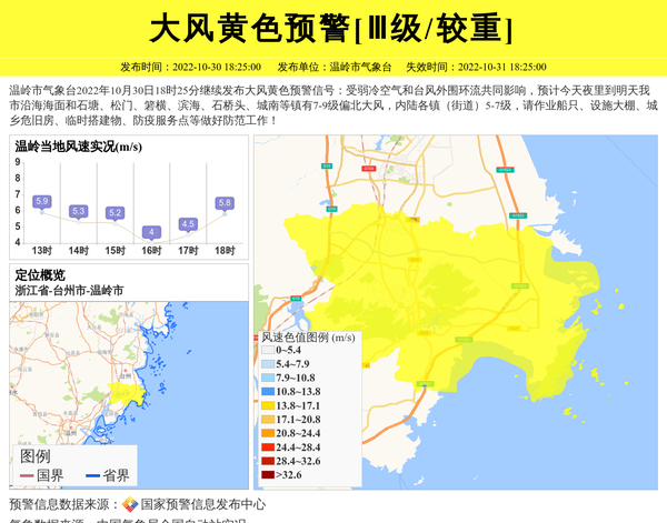 温岭市气象台2022年10月30日18时25分继续发布大风黄色预警信号:受弱冷空气和台风外围环流共同影响,预计今天夜里到明天我市沿海海面和石塘、松门、箬横、滨海、石桥头、城南等镇有7-9级偏北大风,内陆各镇(街道)5-7级,请作业船只、设施大棚、城乡危旧房、临时搭建物、防疫服务点等做好防范工作! 信息来源:国家预警信息发布中心; 发布单位:温岭市气象台。