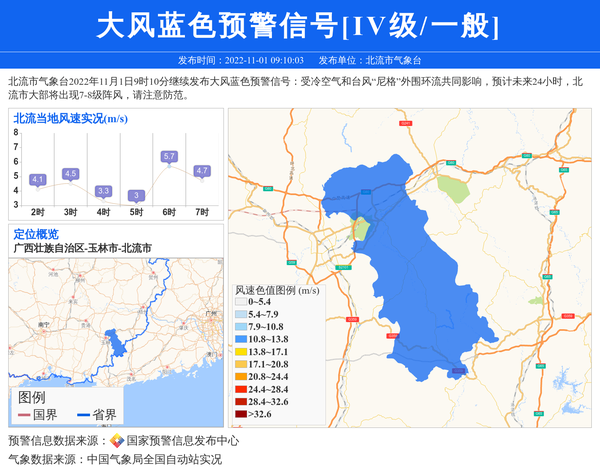 北流市气象台2022年11月1日9时10分继续发布大风蓝色预警信号:受冷空气和台风“尼格”外围环流共同影响,预计未来24小时,北流市大部将出现7-8级阵风,请注意防范。 信息来源:国家预警信息发布中心; 发布单位:北流市气象台。