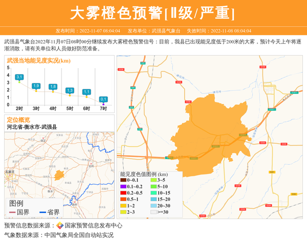 武强县气象台2022年11月07日08时00分继续发布大雾橙色预警信号:目前,我县已出现能见度低于200米的大雾,预计今天上午将逐渐消散,请有关单位和人员做好防范准备。 信息来源:国家预警信息发布中心; 发布单位:武强县气象台。