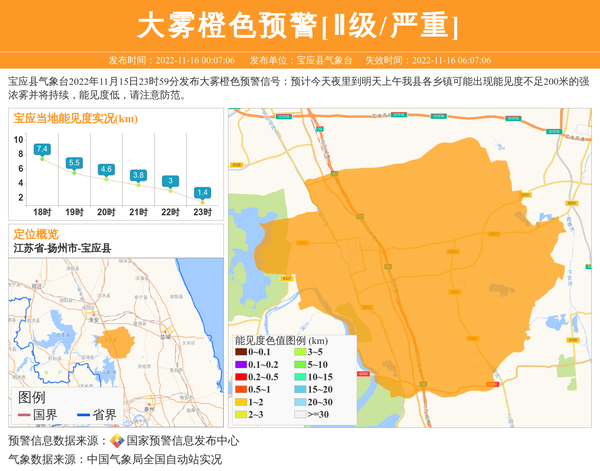 宝应县气象台2022年11月15日23时59分发布大雾橙色预警信号:预计今天夜里到明天上午我县各乡镇可能出现能见度不足200米的强浓雾并将持续,能见度低,请注意防范。 信息来源:国家预警信息发布中心; 发布单位:宝应县气象台。