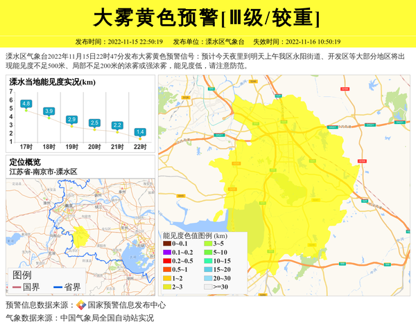 溧水区气象台发布大雾黄色预警[Ⅲ级/较重]