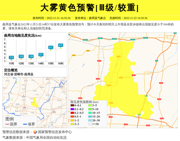 曲周县气象台2022年11月21日16时37分发布大雾黄色预警信号:预计今天夜间到明天上午我县全部乡镇将出现能见度小于500米的雾。请有关单位和人员做好防范准备。 信息来源:国家预警信息发布中心; 发布单位:曲周县气象台。