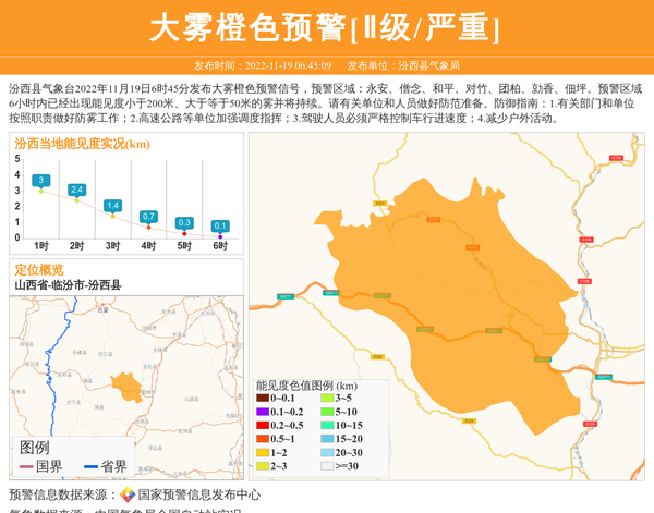 汾西县气象台2022年11月19日6时45分发布大雾橙色预警信号,预警区域:永安、僧念、和平、对竹、团柏、勍香、佃坪。预警区域6小时内已经出现能见度小于200米、大于等于50米的雾并将持续。请有关单位和人员做好防范准备。防御指南:1.有关部门和单位按照职责做好防雾工作;2.高速公路等单位加强调度指挥;3.驾驶人员必须严格控制车行进速度;4.减少户外活动。 信息来源:国家预警信息发布中心; 发布单位:汾西县气象局。