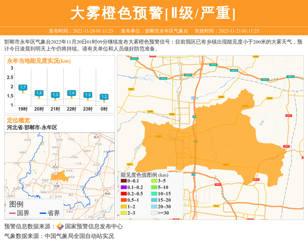邯郸市永年区气象台2022年11月20日01时09分继续发布大雾橙色预警信号:目前我区已有乡镇出现能见度小于200米的大雾天气,预计今日凌晨到明天上午仍将持续。请有关单位和人员做好防范准备。 信息来源:国家预警信息发布中心; 发布单位:邯郸市永年区气象台。