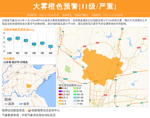 沂南县气象台2022年11月18日04时45分发布大雾橙色预警信号:目前我县城区已出现能见度小于200米的大雾,预计今天凌晨到上午我县全部乡镇和街道大雾天气仍将持续,部分地区能见度小于50米,请注意防范大雾天气对交通带来的不利影响。 信息来源:国家预警信息发布中心; 发布单位:沂南县气象台。