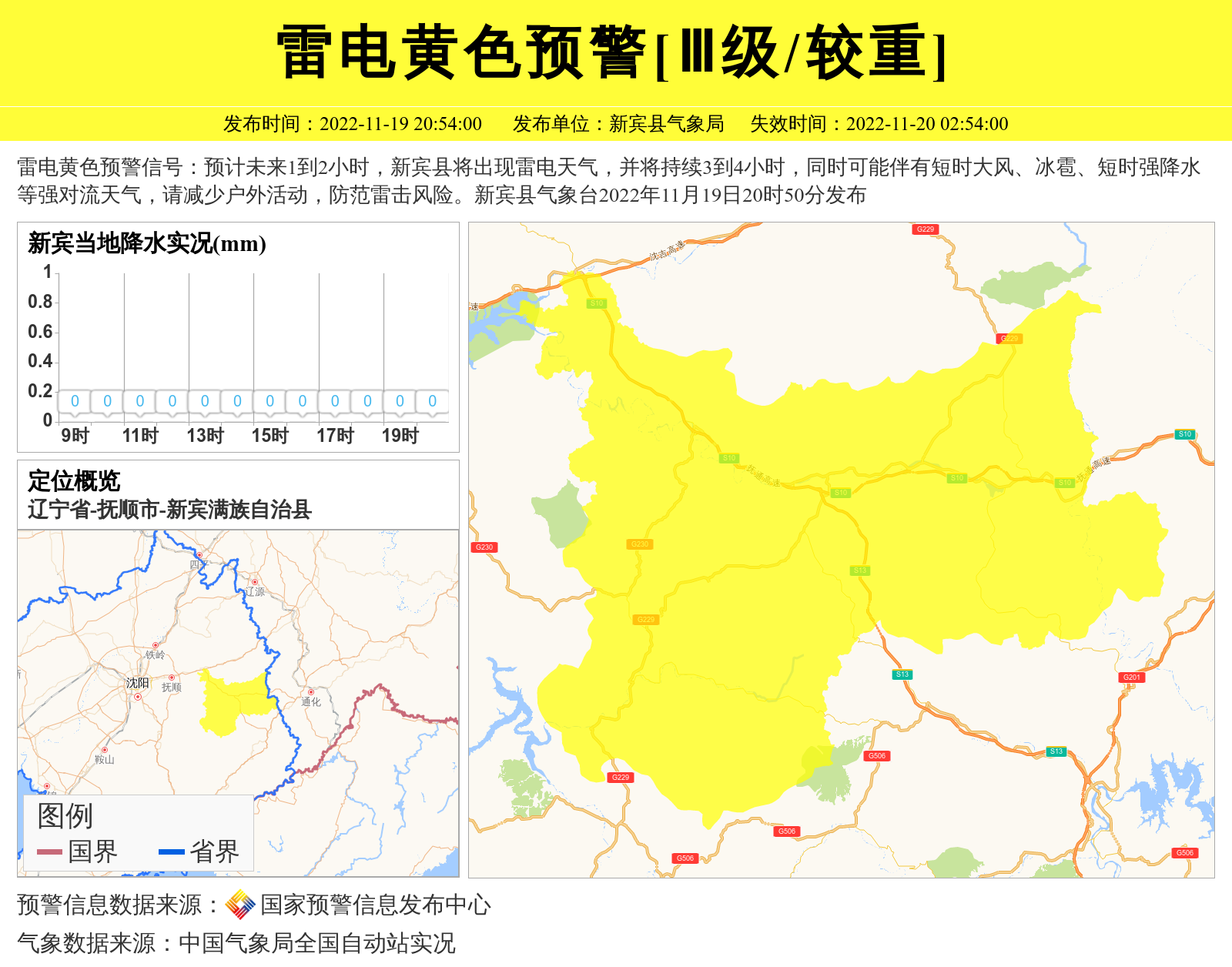 雷电黄色预警信号:预计未来1到2小时,新宾县将出现雷电天气,并将持续3到4小时,同时可能伴有短时大风、冰雹、短时强降水等强对流天气,请减少户外活动,防范雷击风险。新宾县气象台2022年11月19日20时50分发布 信息来源:国家预警信息发布中心; 发布单位:新宾县气象局。