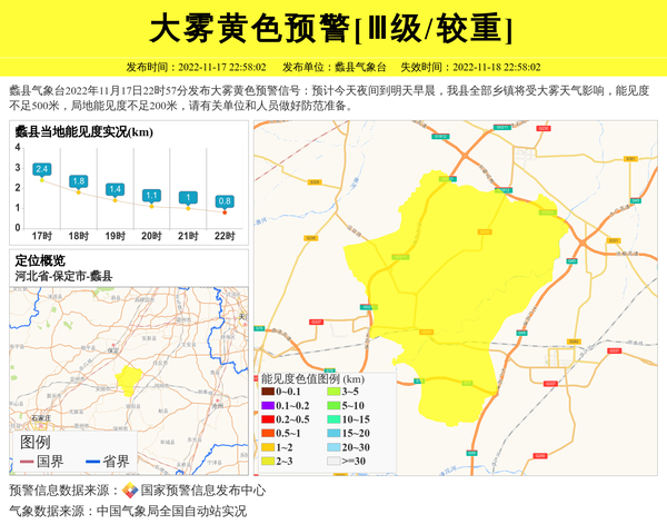 蠡县气象台2022年11月17日22时57分发布大雾黄色预警信号:预计今天夜间到明天早晨,我县全部乡镇将受大雾天气影响,能见度不足500米,局地能见度不足200米,请有关单位和人员做好防范准备。 信息来源:国家预警信息发布中心; 发布单位:蠡县气象台。