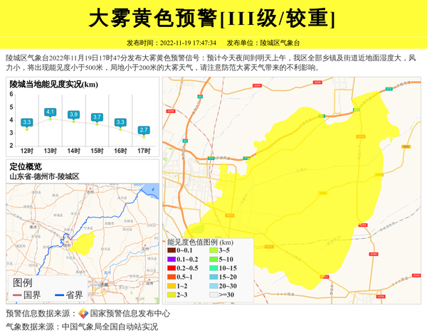 陵城区气象台2022年11月19日17时47分发布大雾黄色预警信号:预计今天夜间到明天上午,我区全部乡镇及街道近地面湿度大,风力小,将出现能见度小于500米,局地小于200米的大雾天气,请注意防范大雾天气带来的不利影响。 信息来源:国家预警信息发布中心; 发布单位:陵城区气象台。