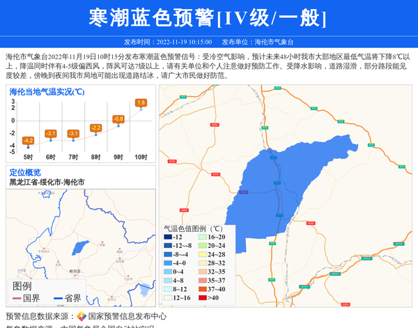 海伦市气象台2022年11月19日10时15分发布寒潮蓝色预警信号:受冷空气影响,预计未来48小时我市大部地区最低气温将下降8℃以上,降温同时伴有4-5级偏西风,阵风可达7级以上,请有关单位和个人注意做好预防工作。受降水影响,道路湿滑,部分路段能见度较差,傍晚到夜间我市局地可能出现道路结冰,请广大市民做好防范。 信息来源:国家预警信息发布中心; 发布单位:海伦市气象台。