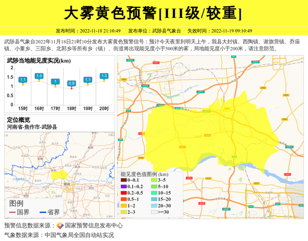 武陟县气象台2022年11月18日21时10分发布大雾黄色预警信号:预计今天夜里到明天上午,我县大封镇、西陶镇、谢旗营镇、乔庙镇、小董乡、三阳乡、北郭乡等所有乡(镇)、街道将出现能见度小于500米的雾,局地能见度小于200米,请注意防范。 信息来源:国家预警信息发布中心; 发布单位:武陟县气象台。