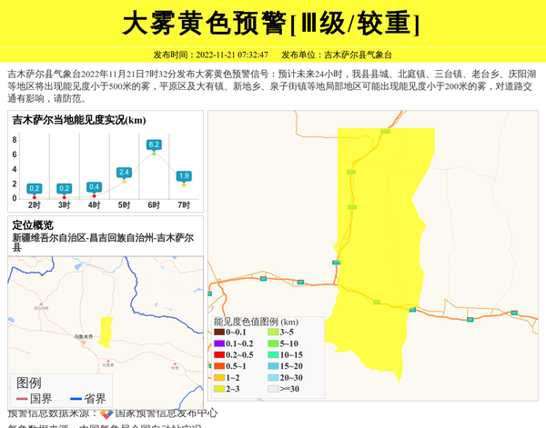 吉木萨尔县气象台2022年11月21日7时32分发布大雾黄色预警信号:预计未来24小时,我县县城、北庭镇、三台镇、老台乡、庆阳湖等地区将出现能见度小于500米的雾,平原区及大有镇、新地乡、泉子街镇等地局部地区可能出现能见度小于200米的雾,对道路交通有影响,请防范。 信息来源:国家预警信息发布中心; 发布单位:吉木萨尔县气象台。