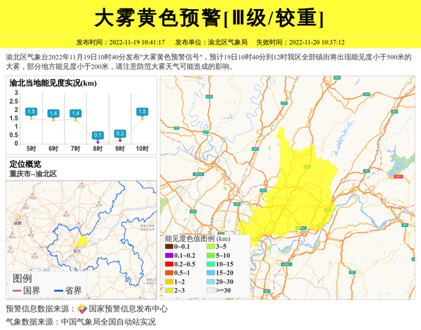 渝北区气象台2022年11月19日10时40分发布"大雾黄色预警信号",预计19日10时40分到12时我区全部镇街将出现能见度小于500米的大雾,部分地方能见度小于200米,请注意防范大雾天气可能造成的影响。 信息来源:国家预警信息发布中心; 发布单位:渝北区气象局。