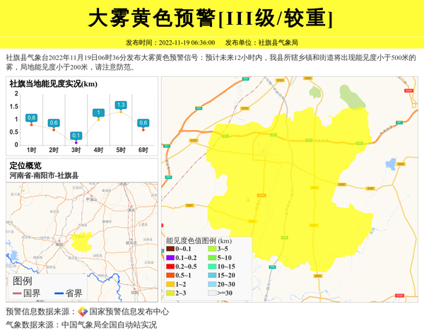 社旗县气象台2022年11月19日06时36分发布大雾黄色预警信号:预计未来12小时内,我县所辖乡镇和街道将出现能见度小于500米的雾,局地能见度小于200米,请注意防范。 信息来源:国家预警信息发布中心; 发布单位:社旗县气象局。