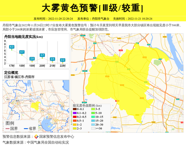 丹阳市气象台2022年11月20日22时17分发布大雾黄色预警信号:预计今天夜里到明天早晨我市大部分镇区将出现能见度小于500米、局部小于200米的浓雾或强浓雾,市应急管理局、市气象局联合提醒加强防范。 信息来源:国家预警信息发布中心; 发布单位:丹阳市气象台。