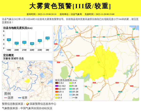 泾县气象台2022年11月19日00时19分发布大雾黄色预警信号。目前我县境内芜黄高速部分路段已出现能见度小于500米的雾,请注意交通安全! 信息来源:国家预警信息发布中心; 发布单位:泾县气象局。