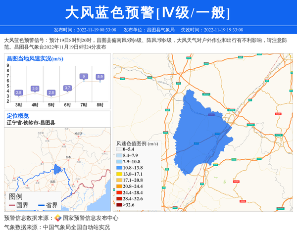 大风蓝色预警信号:预计19日8时到20时,昌图县偏南风5到6级、阵风7到8级,大风天气对户外作业和出行有不利影响,请注意防范。昌图县气象台2022年11月19日8时24分发布 信息来源:国家预警信息发布中心; 发布单位:昌图县气象局。