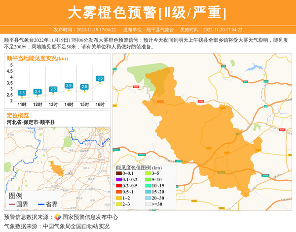 顺平县气象台2022年11月19日17时06分发布大雾橙色预警信号:预计今天夜间到明天上午我县全部乡镇将受大雾天气影响,能见度不足200米,局地能见度不足50米,请有关单位和人员做好防范准备。 信息来源:国家预警信息发布中心; 发布单位:顺平县气象台。