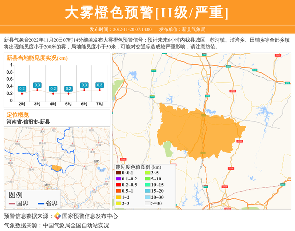 新县气象台2022年11月20日07时14分继续发布大雾橙色预警信号:预计未来6小时内我县城区、苏河镇、浒湾乡、田铺乡等全部乡镇将出现能见度小于200米的雾,局地能见度小于50米,可能对交通等造成较严重影响,请注意防范。 信息来源:国家预警信息发布中心; 发布单位:新县气象局。