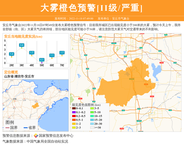 安丘市气象台2022年11月18日07时49分发布大雾橙色预警信号:目前我市城区已出现能见度小于200米的大雾,预计今天上午,我市全部镇(街、区)大雾天气仍将持续,部分地区能见度可能小于50米,请注意防范大雾天气对交通带来的不利影响。 信息来源:国家预警信息发布中心; 发布单位:安丘市气象台。