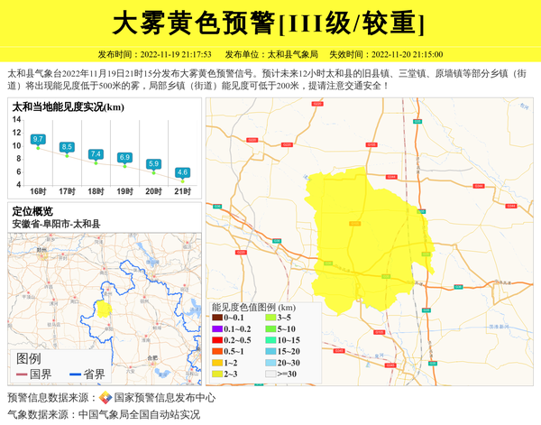 太和县气象台2022年11月19日21时15分发布大雾黄色预警信号。预计未来12小时太和县的旧县镇、三堂镇、原墙镇等部分乡镇(街道)将出现能见度低于500米的雾,局部乡镇(街道)能见度可低于200米,提请注意交通安全! 信息来源:国家预警信息发布中心; 发布单位:太和县气象局。