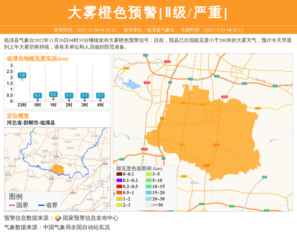 临漳县气象台2022年11月20日04时35分继续发布大雾橙色预警信号:目前,我县已出现能见度小于200米的大雾天气,预计今天早晨到上午大雾仍将持续,请有关单位和人员做好防范准备。 信息来源:国家预警信息发布中心; 发布单位:临漳县气象台。