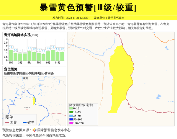 青河县气象台2022年11月21日12时29分将暴雪蓝色升级为暴雪黄色预警信号:预计未来12小时,青河县普遍有中到大雪,布鲁克、拉斯特一线及以北区域将出现暴雪,局地大暴雪,强降雪天气对交通、农牧业生产有较大影响,相关单位做好防范。 信息来源:国家预警信息发布中心; 发布单位:青河县气象台。