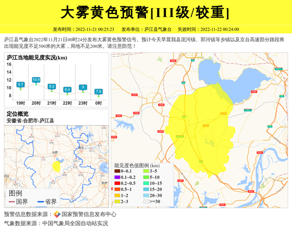 庐江县气象台2022年11月21日00时24分发布大雾黄色预警信号。预计今天早晨我县泥河镇、郭河镇等乡镇以及京台高速部分路段将出现能见度不足500米的大雾,局地不足200米。请注意防范! 信息来源:国家预警信息发布中心; 发布单位:庐江县气象台。