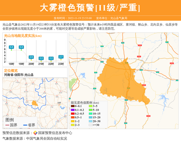 光山县气象台2022年11月19日23时53分发布大雾橙色预警信号:预计未来6小时内我县城区、寨河镇、斛山乡、北向店乡、仙居乡等全部乡镇将出现能见度小于200米的雾,可能对交通等造成较严重影响,请注意防范。 信息来源:国家预警信息发布中心; 发布单位:光山县气象局。