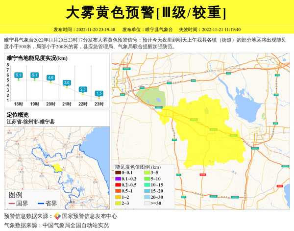 睢宁县气象台2022年11月20日23时17分发布大雾黄色预警信号:预计今天夜里到明天上午我县各镇(街道)的部分地区将出现能见度小于500米,局部小于200米的雾,县应急管理局、气象局联合提醒加强防范。 信息来源:国家预警信息发布中心; 发布单位:睢宁县气象台。