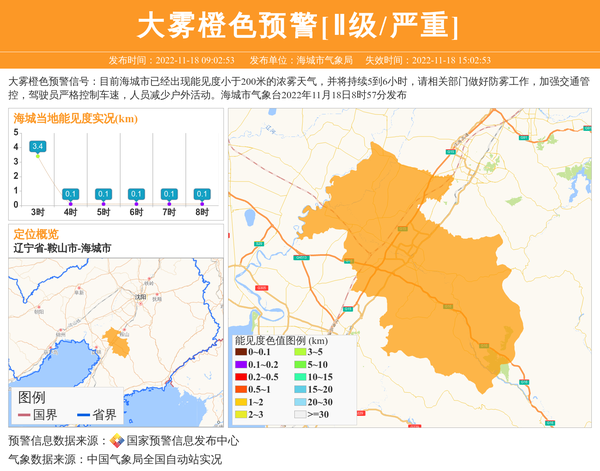 大雾橙色预警信号:目前海城市已经出现能见度小于200米的浓雾天气,并将持续5到6小时,请相关部门做好防雾工作,加强交通管控,驾驶员严格控制车速,人员减少户外活动。海城市气象台2022年11月18日8时57分发布 信息来源:国家预警信息发布中心; 发布单位:海城市气象局。