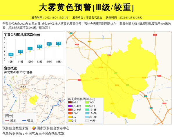 宁晋县气象台2022年11月24日15时24分发布大雾黄色预警信号:预计今天夜间到明天上午,我县全部乡镇将出现能见度低于500米的雾,局地能见度不足200米。请防范! 信息来源:国家预警信息发布中心; 发布单位:宁晋县气象台。