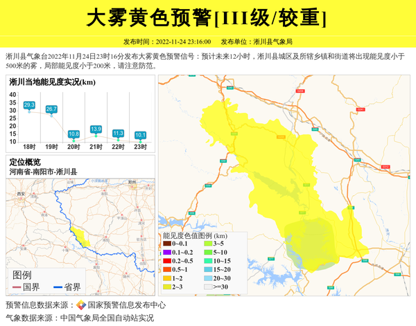 淅川县气象台2022年11月24日23时16分发布大雾黄色预警信号:预计未来12小时,淅川县城区及所辖乡镇和街道将出现能见度小于500米的雾,局部能见度小于200米,请注意防范。 信息来源:国家预警信息发布中心; 发布单位:淅川县气象局。