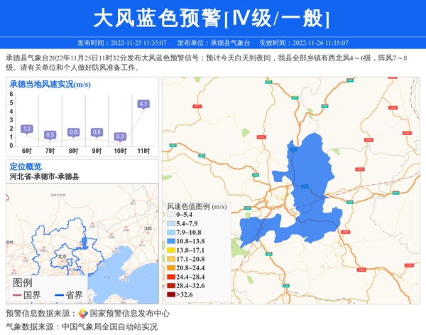 承德县气象台2022年11月25日11时32分发布大风蓝色预警信号:预计今天白天到夜间,我县全部乡镇有西北风4~6级,阵风7~8级。请有关单位和个人做好防风准备工作。 信息来源:国家预警信息发布中心; 发布单位:承德县气象台。