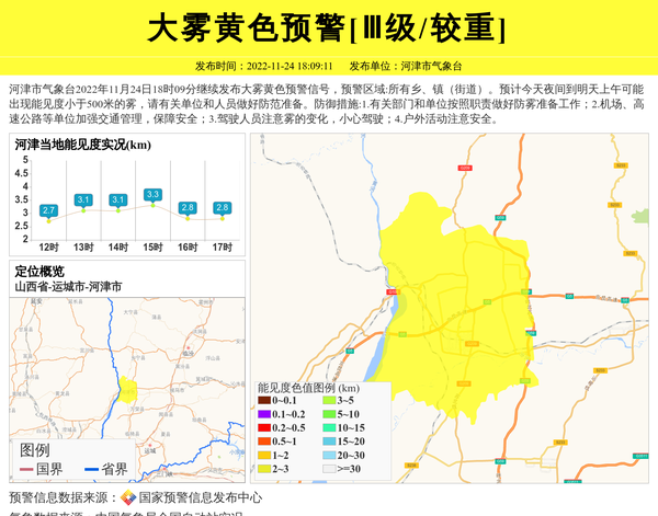 河津市气象台2022年11月24日18时09分继续发布大雾黄色预警信号,预警区域:所有乡、镇(街道)。预计今天夜间到明天上午可能出现能见度小于500米的雾,请有关单位和人员做好防范准备。防御措施:1.有关部门和单位按照职责做好防雾准备工作;2.机场、高速公路等单位加强交通管理,保障安全;3.驾驶人员注意雾的变化,小心驾驶;4.户外活动注意安全。 信息来源:国家预警信息发布中心; 发布单位:河津市气象台。