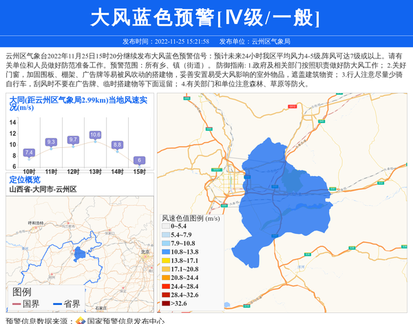 云州区气象台2022年11月25日15时20分继续发布大风蓝色预警信号:预计未来24小时我区平均风力4-5级,阵风可达7级或以上。请有关单位和人员做好防范准备工作。预警范围:所有乡、镇(街道)。 防御指南: 1.政府及相关部门按照职责做好防大风工作; 2.关好门窗,加固围板、棚架、广告牌等易被风吹动的搭建物,妥善安置易受大风影响的室外物品,遮盖建筑物资; 3.行人注意尽量少骑自行车,刮风时不要在广告牌、临时搭建物等下面逗留; 4.有关部门和单位注意森林、草原等防火。 信息来源:国家预警信息发布中心; 发布单位:云州区气象局。