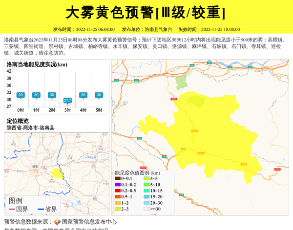 洛南县气象台2022年11月25日06时08分发布大雾黄色预警信号:预计下述地区未来12小时内将出现能见度小于500米的雾:高耀镇、三要镇、四皓街道、景村镇、古城镇、柏峪寺镇、永丰镇、保安镇、灵口镇、洛源镇、麻坪镇、石坡镇、石门镇、寺耳镇、巡检镇、城关街道,请注意防范。 信息来源:国家预警信息发布中心; 发布单位:洛南县气象台。