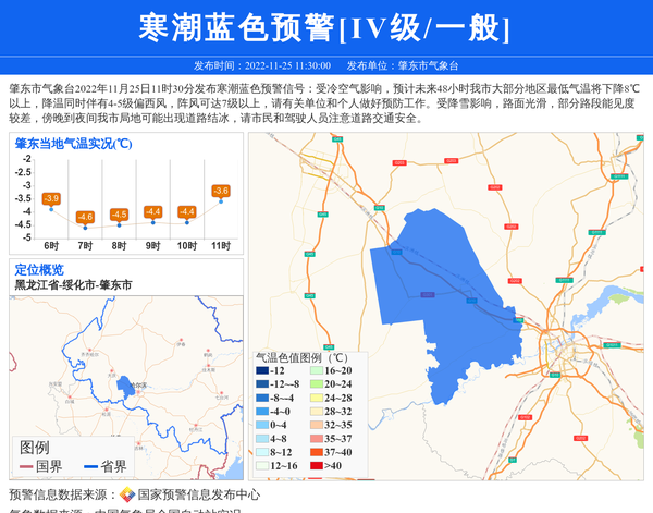 肇东市气象台2022年11月25日11时30分发布寒潮蓝色预警信号:受冷空气影响,预计未来48小时我市大部分地区最低气温将下降8℃以上,降温同时伴有4-5级偏西风,阵风可达7级以上,请有关单位和个人做好预防工作。受降雪影响,路面光滑,部分路段能见度较差,傍晚到夜间我市局地可能出现道路结冰,请市民和驾驶人员注意道路交通安全。 信息来源:国家预警信息发布中心; 发布单位:肇东市气象台。