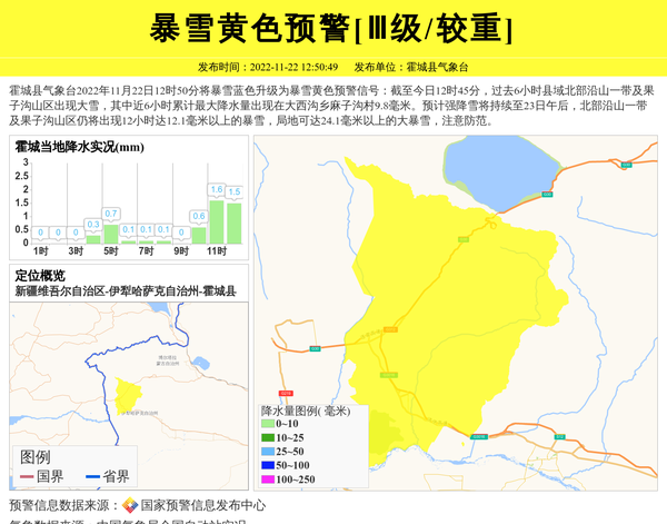 霍城县气象台2022年11月22日12时50分将暴雪蓝色升级为暴雪黄色预警信号:截至今日12时45分,过去6小时县域北部沿山一带及果子沟山区出现大雪,其中近6小时累计最大降水量出现在大西沟乡麻子沟村9.8毫米。预计强降雪将持续至23日午后,北部沿山一带及果子沟山区仍将出现12小时达12.1毫米以上的暴雪,局地可达24.1毫米以上的大暴雪,注意防范。 信息来源:国家预警信息发布中心; 发布单位:霍城县气象台。