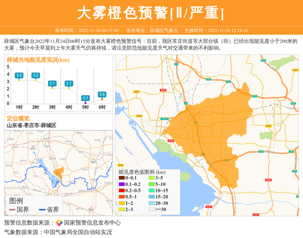 薛城区气象台2022年11月24日06时15分发布大雾橙色预警信号:目前,我区常庄街道等大部分镇(街)已经出现能见度小于200米的大雾,预计今天早晨到上午大雾天气仍将持续,请注意防范低能见度天气对交通带来的不利影响。 信息来源:国家预警信息发布中心; 发布单位:薛城区气象台。