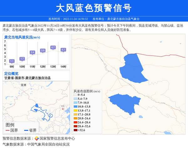 肃北蒙古族自治县气象台2022年11月24日14时50分发布大风蓝色预警信号:预计今天下午到夜间,我县党城湾镇、马鬃山镇、盐池湾乡、石包城乡有5~6级大风,阵风7~8级,并伴有沙尘。请有关单位和人员做好防范准备。 信息来源:国家预警信息发布中心; 发布单位:肃北蒙古族自治县气象台。