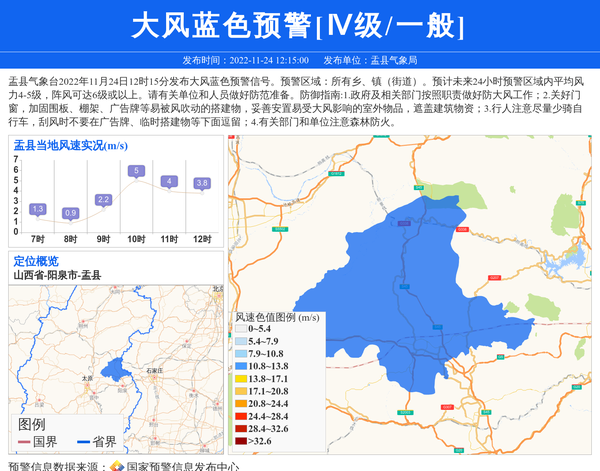 盂县气象台2022年11月24日12时15分发布大风蓝色预警信号。预警区域:所有乡、镇(街道)。预计未来24小时预警区域内平均风力4-5级,阵风可达6级或以上。请有关单位和人员做好防范准备。防御指南:1.政府及相关部门按照职责做好防大风工作;2.关好门窗,加固围板、棚架、广告牌等易被风吹动的搭建物,妥善安置易受大风影响的室外物品,遮盖建筑物资;3.行人注意尽量少骑自行车,刮风时不要在广告牌、临时搭建物等下面逗留;4.有关部门和单位注意森林防火。 信息来源:国家预警信息发布中心; 发布单位:盂县气象局。