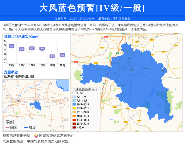 淄川区气象台2022年11月24日20时26分发布大风蓝色预警信号:目前,我区岭子镇、龙泉镇和西河镇已经出现阵风7级以上的西南风,预计今天夜间到明天白天我区全部镇和街道将出现平均风力4~5级阵风7~8级的西南风。请注意防范。 信息来源:国家预警信息发布中心; 发布单位:淄川区气象台。