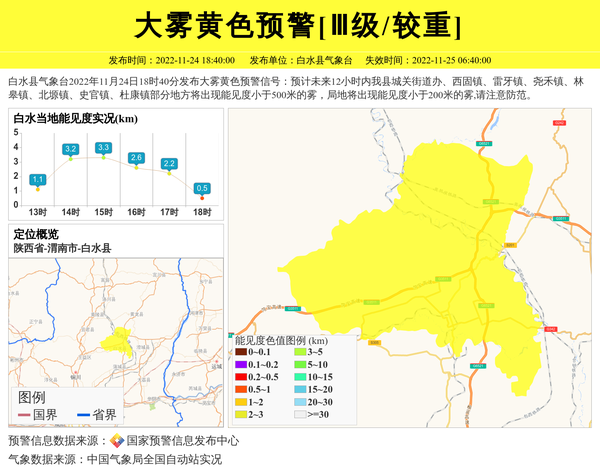 白水县气象台2022年11月24日18时40分发布大雾黄色预警信号:预计未来12小时内我县城关街道办、西固镇、雷牙镇、尧禾镇、林皋镇、北塬镇、史官镇、杜康镇部分地方将出现能见度小于500米的雾,局地将出现能见度小于200米的雾,请注意防范。 信息来源:国家预警信息发布中心; 发布单位:白水县气象台。