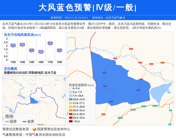 吉木乃县气象台2022年11月22日18时10分发布大风蓝色预警信号:预计23日中午~夜间,吉木乃县乌拉斯特镇、托斯特乡、喀尔交镇、恰勒什海乡等乡镇有7~8级偏西阵风,风口及戈壁风力9级,易出现风吹雪现象,请注意防范。 (风力等级为蒲氏风力) 信息来源:国家预警信息发布中心; 发布单位:吉木乃县气象台。