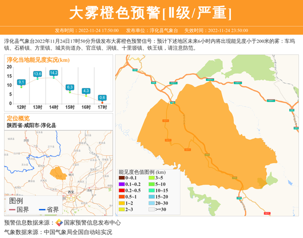 淳化县气象台2022年11月24日17时50分升级发布大雾橙色预警信号:预计下述地区未来6小时内将出现能见度小于200米的雾:车坞镇、石桥镇、方里镇、城关街道办、官庄镇、润镇、十里塬镇、铁王镇,请注意防范。 信息来源:国家预警信息发布中心; 发布单位:淳化县气象台。
