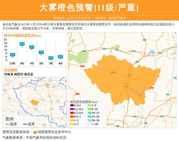 南召县气象台2022年11月25日04时55将大雾黄色预警信号升级为大雾橙色预警信号:南召县城区及所辖乡镇和街道已出现能见度小于200米的雾,局部能见度小于50米,并将持续,请注意防范。 信息来源:国家预警信息发布中心; 发布单位:南召县气象局。