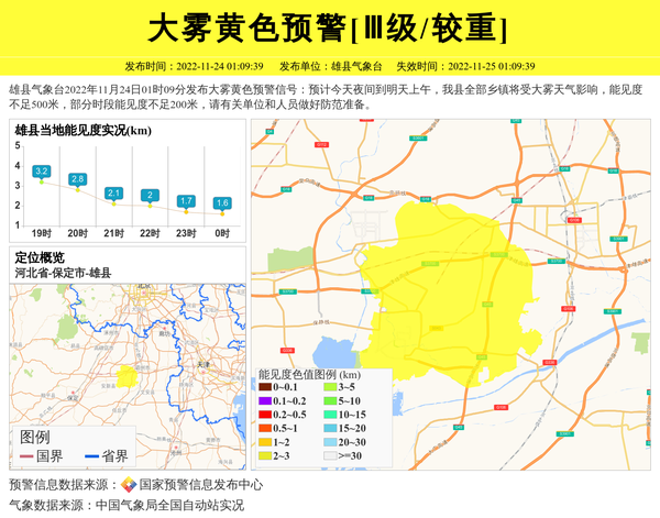 雄县气象台2022年11月24日01时09分发布大雾黄色预警信号:预计今天夜间到明天上午,我县全部乡镇将受大雾天气影响,能见度不足500米,部分时段能见度不足200米,请有关单位和人员做好防范准备。 信息来源:国家预警信息发布中心; 发布单位:雄县气象台。